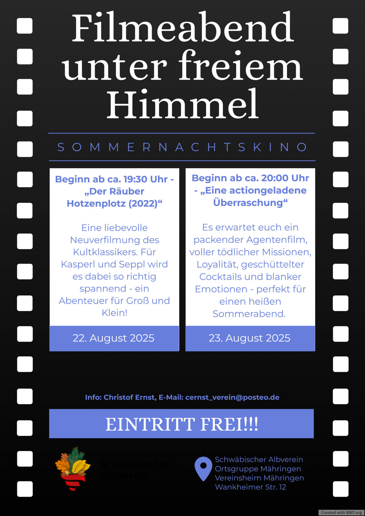 Sommernachtskino 23.8. (ab 20:00): Erwachsenenfilm: James Bond 007 – Keine Zeit zu Sterben (2021) Sa., 23.08.2025, Veranstaltungsort ist beim Vereinsheim (Wankheimer Str. 12, Kusterdingen-Mähringen) Herzliche Einladung! Uhrzeit: 20:00 - 23:00 iCalendar Mit dem Laden der Karte akzeptieren Sie die Datenschutzerklärung von Google.Mehr erfahren Karte laden Google Maps immer entsperren zur Übersicht