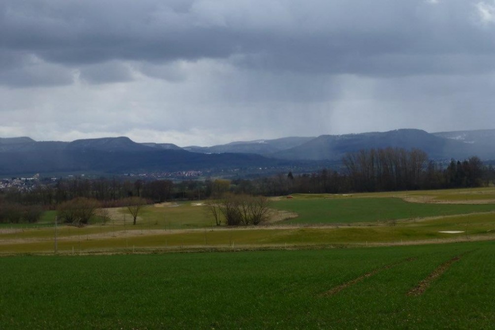 Der Golfplatz, eingeweiht Oktober 2008, wurde laufend erweitert und ist seit 2013 mit vollen 18 Löchern bespielbar. Mit einer Gesamtlänge von 6.691 Metern ist er damit einer der längsten Golfplätze Deutschlands mit 130 Hektar, eingerahmt von alten Baumbeständen. Der Ausblick – einfach grandios – vom Hohen Neuffen bis zum Hohenzollern! Das Hofgut Eck ist im Besitz der Freiherren von Saint-André, die auch Besitzer des Schlosses Kreßbach sind. Nach dem Eckhof überraschte uns ein kurzer, aber heftiger Graupelschauer.