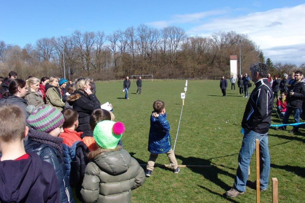 Geworfen wurde in Altersgruppen beginnend mit den Kleinsten. Gesiegt hat dort Christan Bock, gefolgt von Leni (Alter 6-10), Arkip (7-10), Alina und Noah (11-16). Noah Schäfer (14 Jahre) wurde Sieger des Tages mit 65 Metern. Er toppte sogar die Männer, die über den weitesten Wurf mit 61,5 (Andreas Riehle) nicht hinauskamen. Bei den Frauen warf Franziska Müller mit 41,5 Metern den Rekord. Somit siegte der 14-jährige Noah und erhielt den Gutschein in Höhe von 20,00 € einzulösen im Sportheim Mähringen. Jedoch ging kein Kind leer aus, jedes bekam einen Schokohasen, ebenso Erwachsenen.