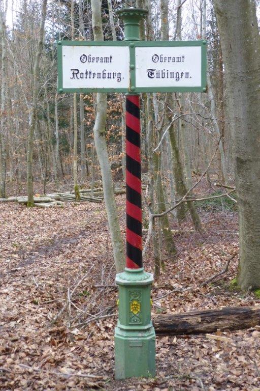 Auf Waldwegen mit Durchblick auf die Wurmlinger Kapelle kamen wir zu einem württembergischen Oberamts-Grenzpfahl „Oberamt Rottenburg / Oberamt Tübingen“. Auf Nachfrage, wie lange dieser schon steht, diese (von einem Ortskundigen) Antwort: << Der steht von Anfang an dort, wo er steht, seit damals >>. Alles klar?