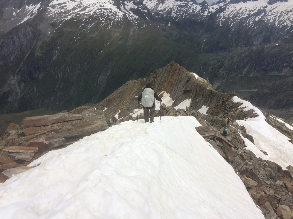 Über die mit Drahtseilen gesicherte Ostflanke steigen wir auf nassem Fels vorsichtig ab zum Nordostgrat. Auf Schneefelder immer am Grat entlang und bei immer mehr Sonnenschein erreichen wir das Graberkees – ein Paradies für Murmeltiere, Gämsen, Schafe und Ziegen. Immer mit Blick auf die imposante Gletschermoräne des Großen Mösler.