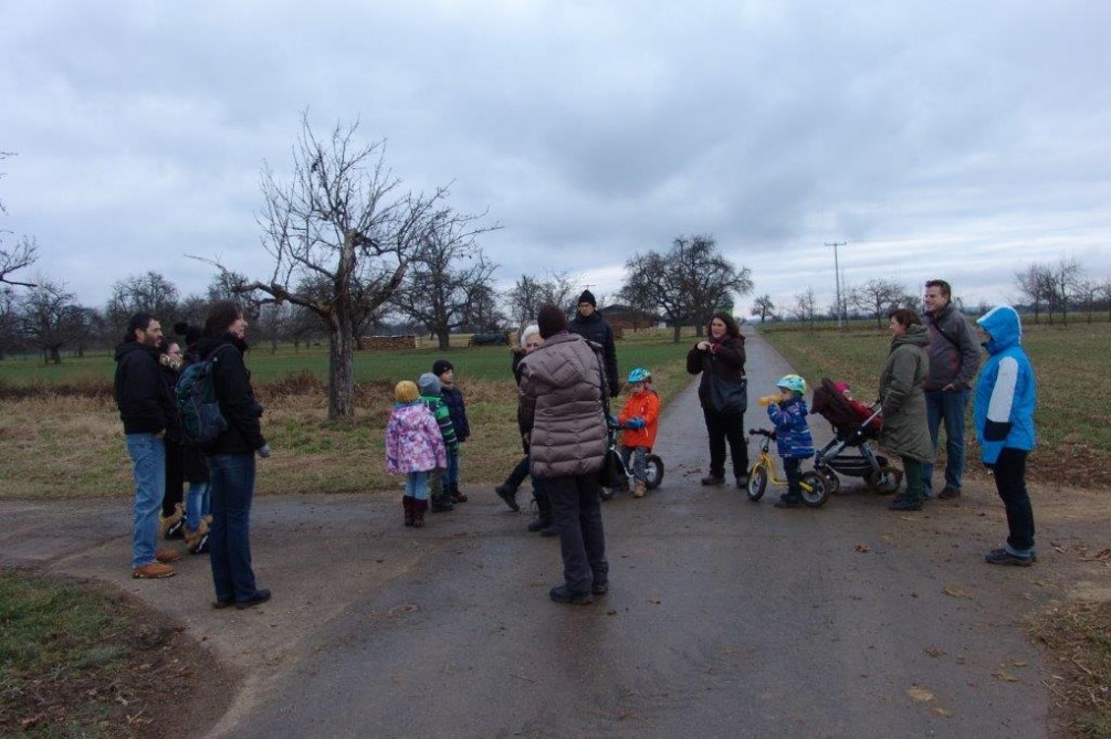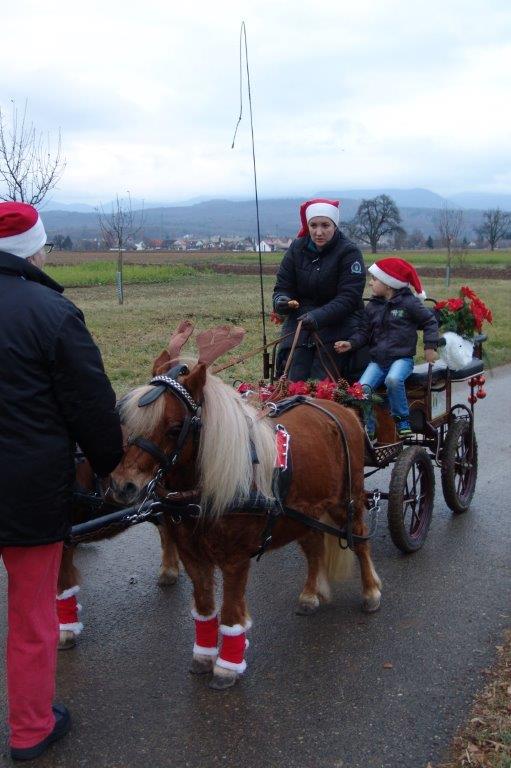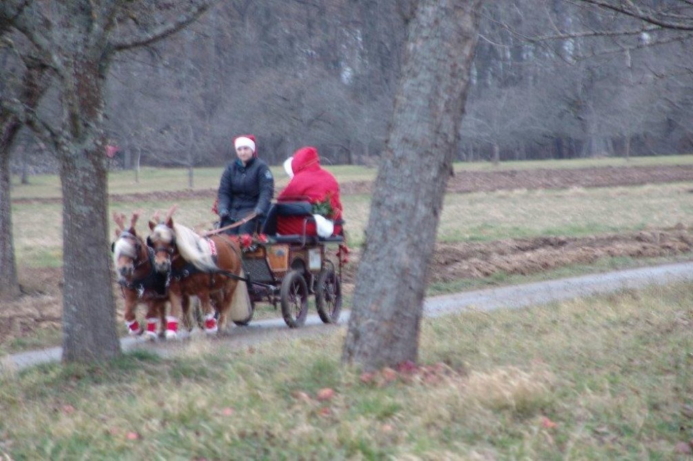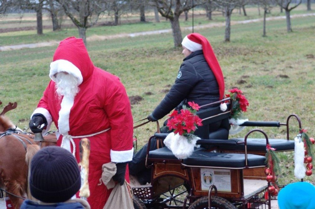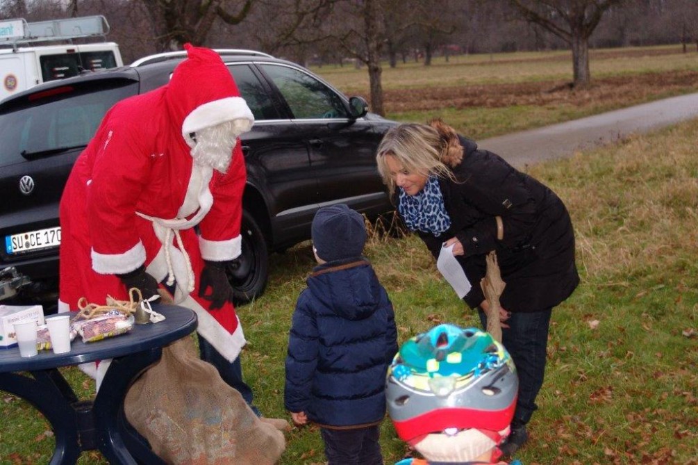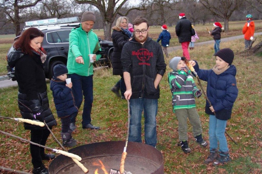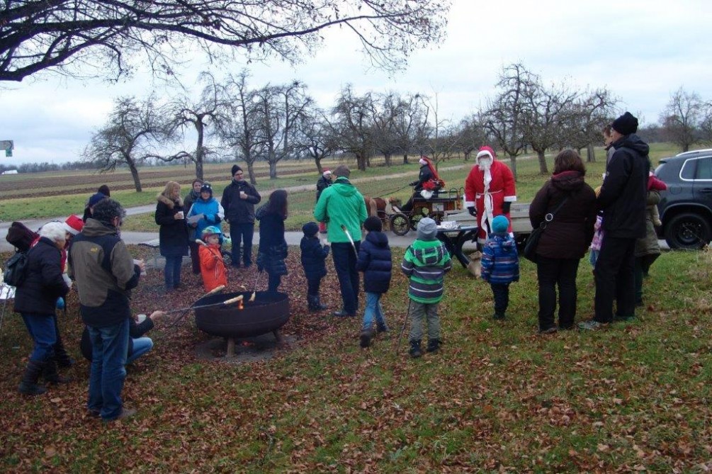 Voller Erwartung marschierten 16 Erwachsene und sechs Kinder los Richtung Hartwald. Immer wieder wurde nach dem Nikolaus gerufen. Auch vom Hochsitz aus konnte er nicht erspäht werden. Mancher meinte, ihn schon auf dem Vizinalsträßchen nach Wankheim gesehen zu haben. Mit Spannung näherte man sich den am „Saubrunnen“ neu aufgestellten Bänken. Dort loderte schon ein Lagerfeuer, und das angebotene Stockbrot erwies sich als Renner, nicht nur für die Kinder. Endlich – von Wankheim her kam der Nikolaus mit seiner Kutsche und dem „Rentiergespann“. Und er ließ sich auch beim Schenken nicht lange bitten, aber ein Gedicht wollte er schon hören. Keine Frage, die Kinder hatten das gut einstudiert.