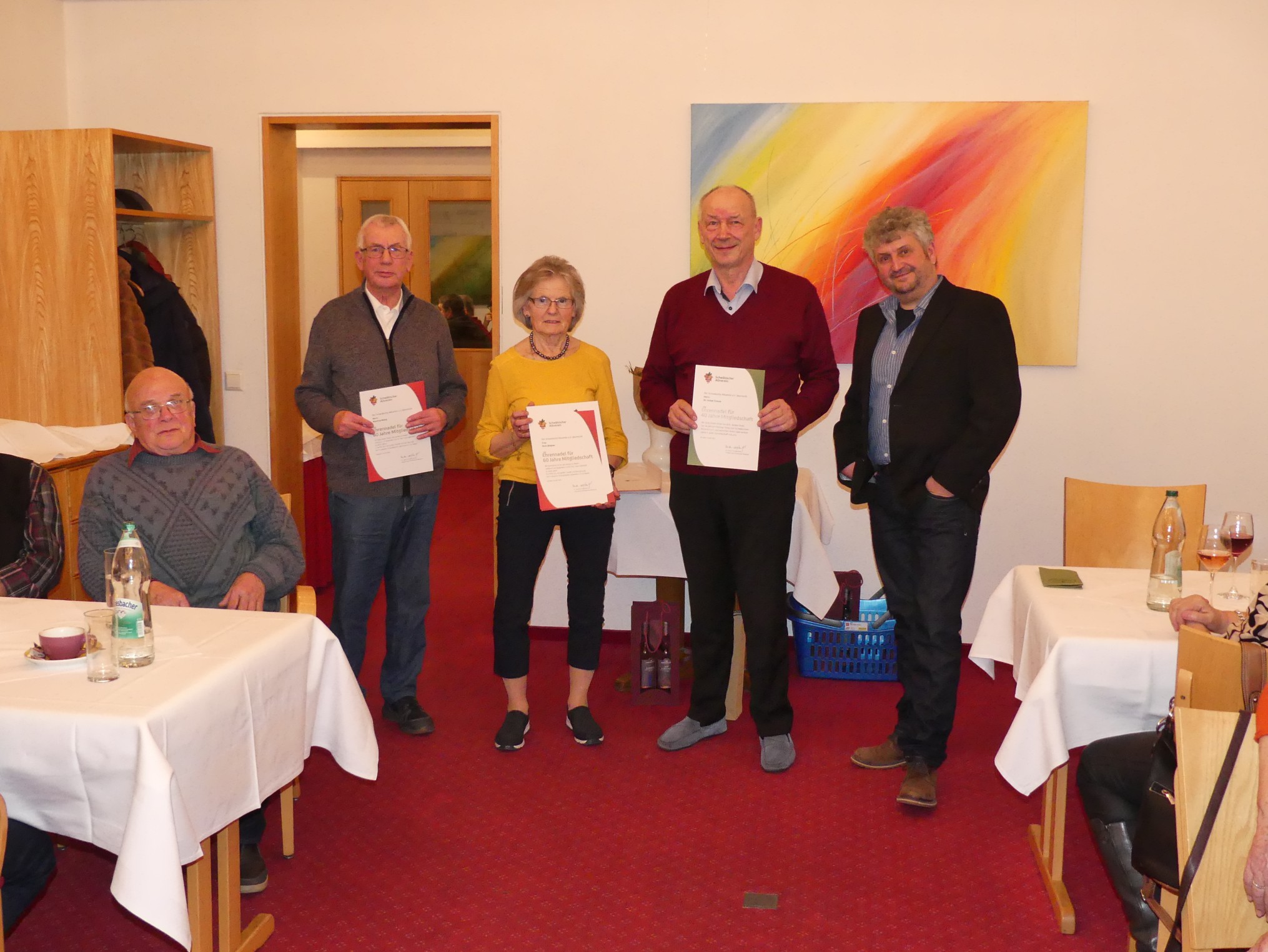 Für 40 Jahre Mitgliedschaft Dr. Volker Krause, für 60 Jahre Ruth Biegner und Manfred Mang. Ihnen wurden die Urkunden und Ehrennadeln des Schwäbischen Albvereins überreicht. Den Jubilarinnen und Jubilaren, die an der Versammlung nicht teilnehmen konnten, werden die Urkunde und Ehrennadel nachträglich übergeben.