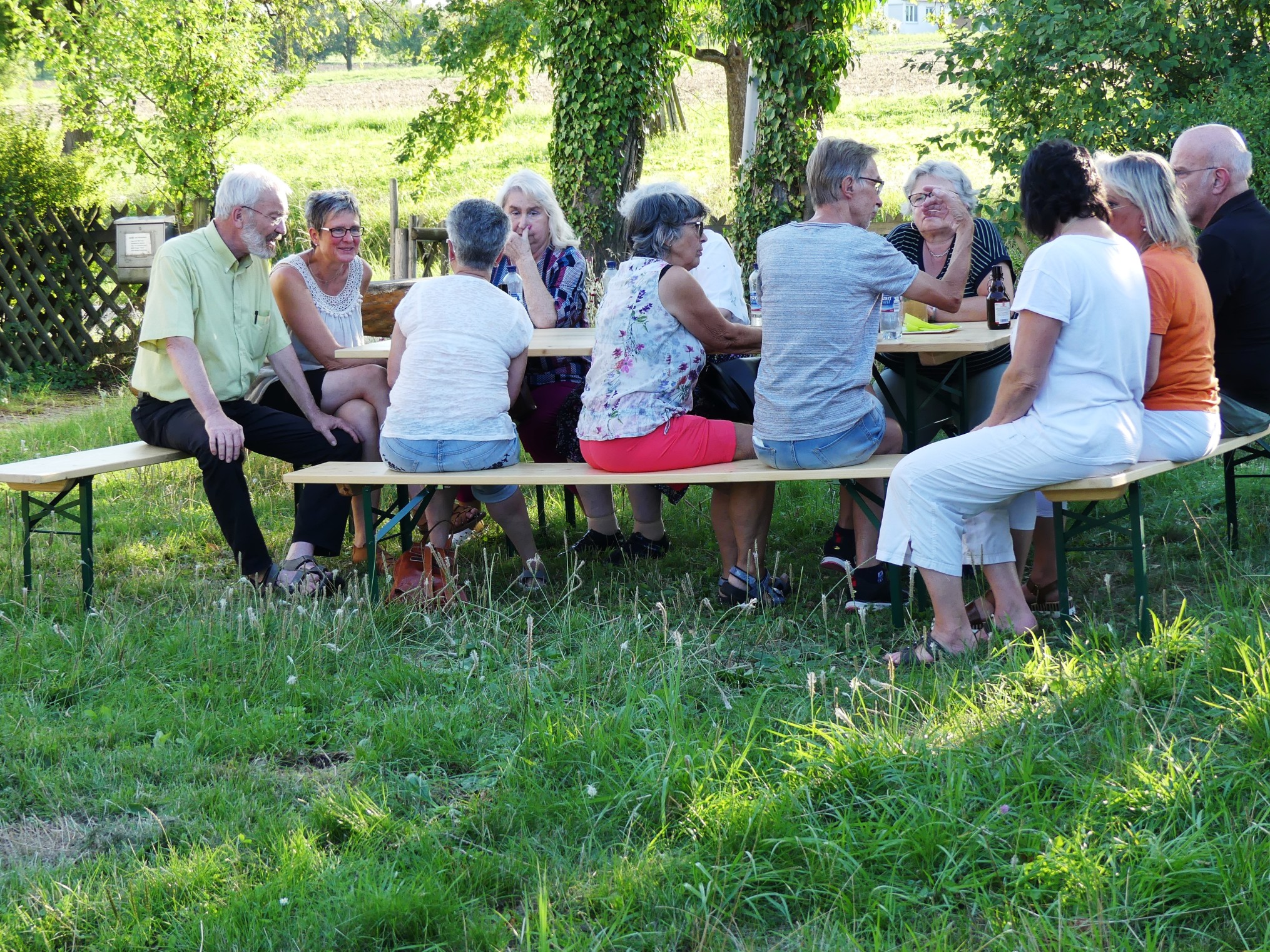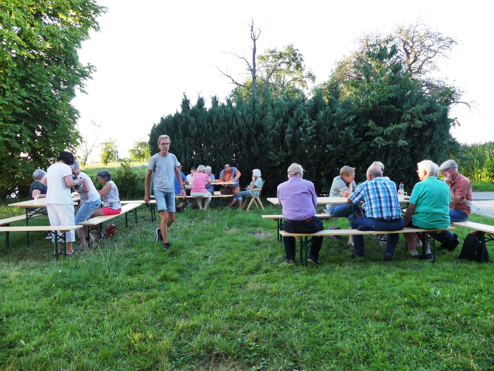 28 hungrige und durstige Mitglieder und Gäste ließen es sich bei anfangs heißen Temperaturen, die im Laufe des Abends aber immer angenehmer wurden, vor dem Vereinsheim der Ortsgruppe in Mähringen gut gehen.